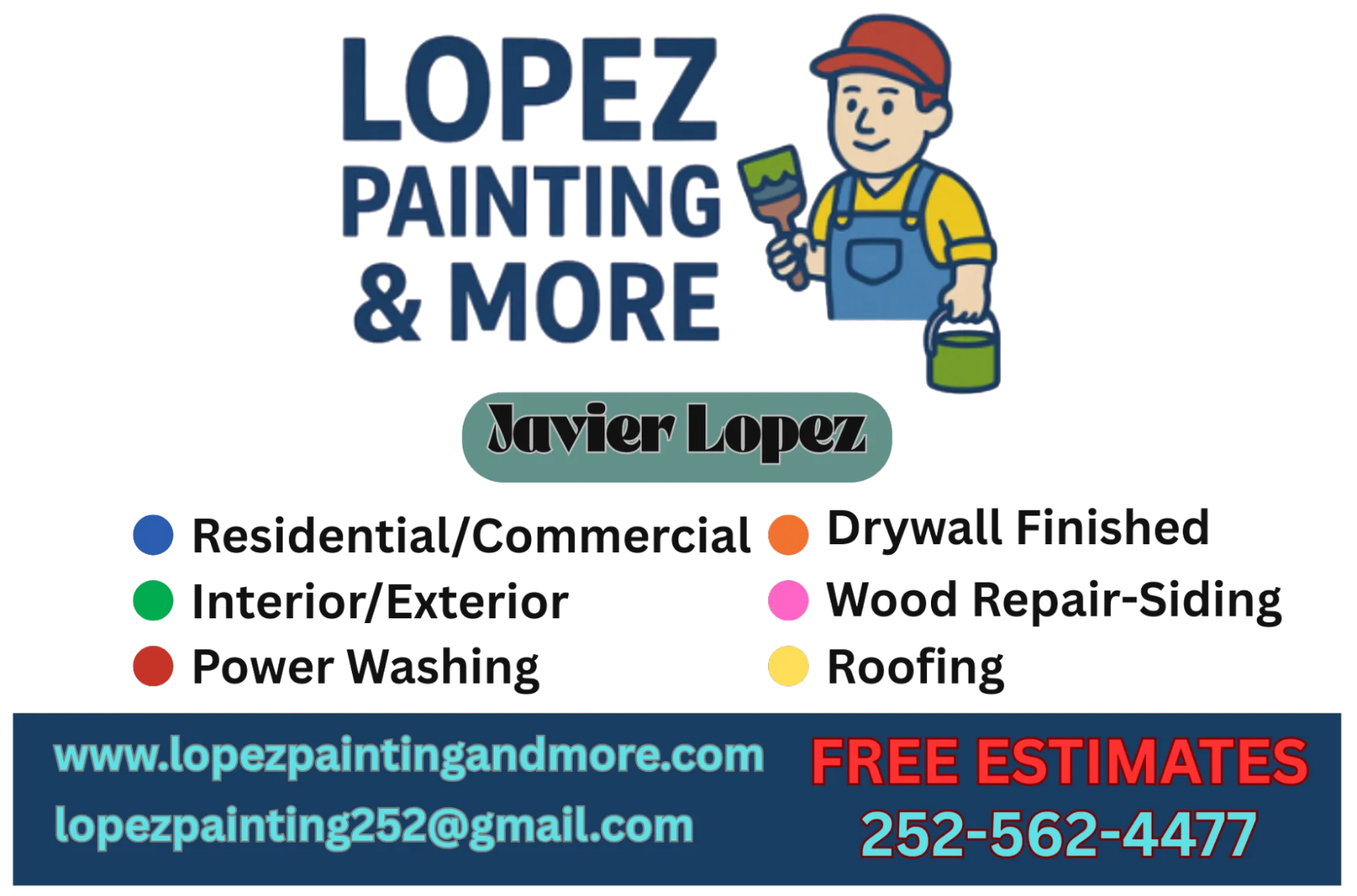EXCELLENT Based on 22 reviews Posted on DianaTrustindex verifies that the original source of the review is Google. We had a very pleasant experience with Javier and his team. He accommodated us in the immediate servicing of select walls on our interior home, as well as entire painting of our home exterior and shed. This was in concert with a contracted roofer to complete the projects as early as possible. Javier and his team were very pleasant and professional. They arrived on or before their expected time, cleaned up property and worked diligently throughout each days work, and made sure they completed work to our satisfaction. We will consider them for future work and would certainly recommend them to others.Posted on Linda LicavoliTrustindex verifies that the original source of the review is Google. Just moved to town and in a hurry to get things done. Lopez painting came to our rescue. They showed up ready to work and on time did an excellent job and they were professional as well and focused on their work. I will call them if I have more work.Posted on Lisa McLainTrustindex verifies that the original source of the review is Google. I cannot say enough positive things about Javier and his team. They did an amazing job painting the exterior of my home (siding, shutters, trim, and even touched up the house numbers), as well as replacing the wood siding that was damaged from years of neglect. Not only was the price fair, but the attention to detail, the workmanship and the finished product were above and beyond my expectations. I would give them 10 stars if I could. If you are looking for a top quality painter with honest pricing, stop everything and call Lopez Painting & More, Inc. You will be so happy you did. It was worth every cent to have a home I'm thrilled to have seen by others.Posted on Allison SandersTrustindex verifies that the original source of the review is Google. Javier did an excellent job on my house and kitchen. Would recommend 10 out 10 for his work. Will definitely be calling him again. Charlie GordonPosted on Joe BournTrustindex verifies that the original source of the review is Google. Lopez painting did an amazing job on the old parsonage of our local Baptist church. The house felt dated with the dark brown paneling and brown cabinets in the kitchen. Now the house looks much more open, bright, and enjoyable to look at! So many people have been impressed including myself! Additionally, Lopez painting did great on our outside railings and shutters! Thank you!Posted on Beverly HouserTrustindex verifies that the original source of the review is Google. Lopez Painting & More came highly recommended by one of my neighbors. I had a huge job I wanted done. I wanted my entire first floor painted (over 2,000 square ft), including all my kitchen cabinets. They did a spectacular job! I could not be more pleased. They didn’t just paint, they repaired numerous settling cracks, nail pops and all imperfections in a couple of my walls. They took special care in protecting my floors, furniture and my stone fireplace. All I can say about my kitchen cabinets is WOW!! Another neighbor came to see the work I had done and they thought I had brand new cabinets, that’s how great of a job they did. I will definitely be hiring them again for some pressure washing and more painting my upstairs. Javier Lopez and his crew are the best!!Posted on Kathy LammTrustindex verifies that the original source of the review is Google. So incredibly thrilled with the work Lopez Painting did on our Snug house!! It looks amazing. They exceeded our expectations with their meticulous attention to detail, professionalism, focus on quality, and how quickly they completed the work. I highly recommend their services!!Posted on Charlene GeraldTrustindex verifies that the original source of the review is Google. Javier and his team did an OUTSTANDING Job on short notice. They repainted all of my downstairs ceilings and trimmed in the walls after having my entire house re-plumbed due to poorly installed and faulty pex tubing that was used by the home builder. I will be contacting Javier and his crew for more work that will be performed in the very near future!!!!Posted on Chuck PetersTrustindex verifies that the original source of the review is Google. If I could give Javier 10 stars instead of 5 I would. Javier and his team did a beautiful job on painting my boat house. They had to get in the sound on ladders and I mean to tell you I'm so pleased with the work they done and I will definitely be using them again. They battled the heat and did not stop until the work was done. Great Job Javier and your team.Posted on Richard WilliamsonTrustindex verifies that the original source of the review is Google. Lopez Painting & More did a great job transforming our 34 year old trailer into a brand new look. We had the best experience anyone could ask for. We were in constant communication with them. They were efficient, showed up on time, and did a fantastic job! They even made a follow-up phone call to make sure that we were happy with the job that was done. We will certainly call them again and recommend them to anyone who needs a reliable painter.Verified by TrustindexTrustindex verified badge is the Universal Symbol of Trust. Only the greatest companies can get the verified badge who has a review score above 4.5, based on customer reviews over the past 12 months. Read more